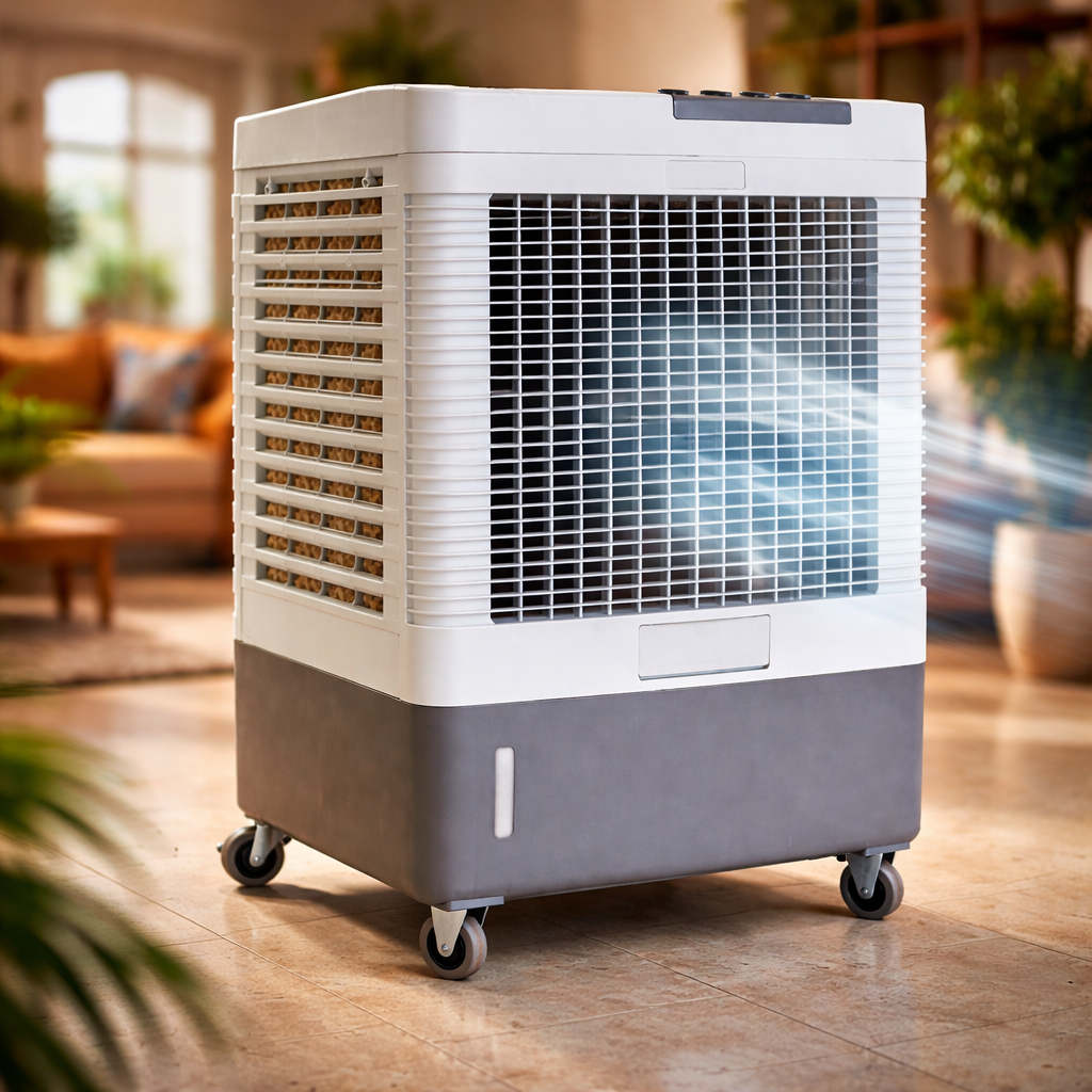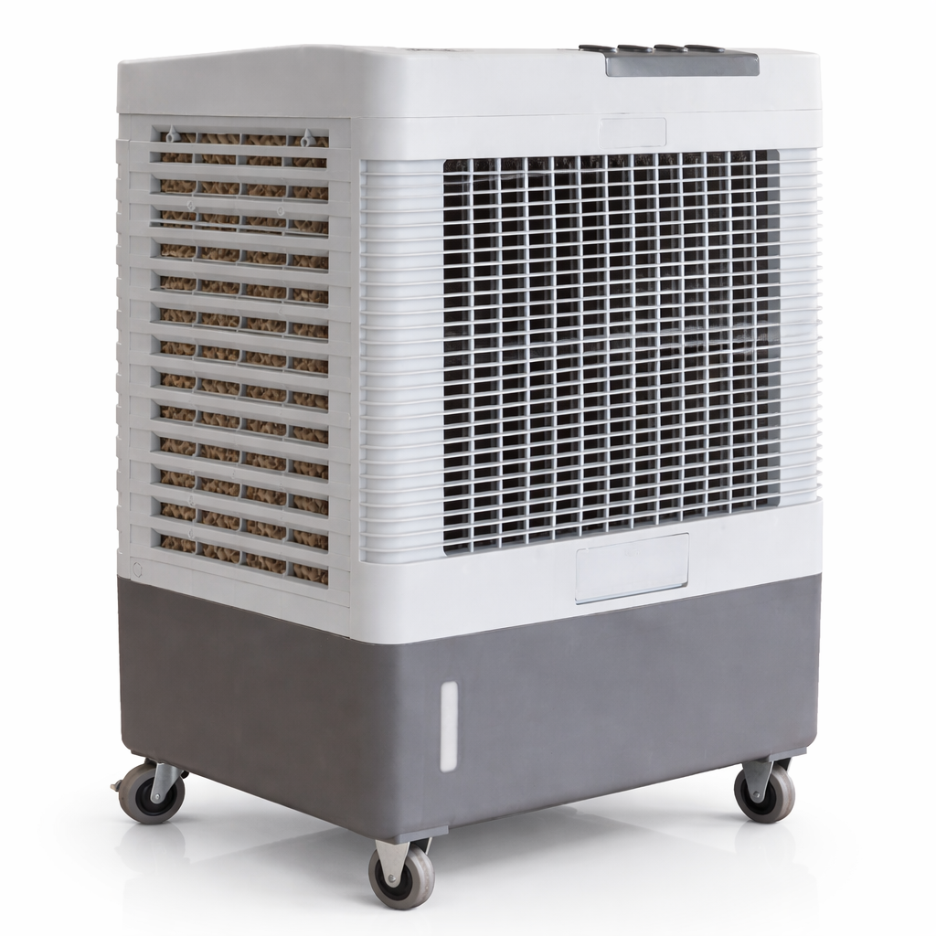 Este aire reforzado es adecuado para patios, terrazas, talleres, áreas de carga, espacios comerciales, bodegas o zonas donde se requiere flujo de aire constante con capacidad de enfriamiento evaporativo.