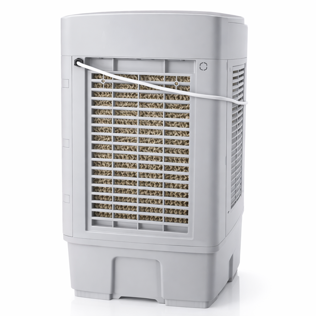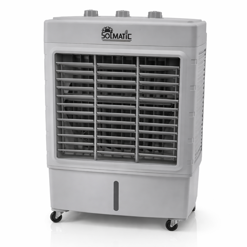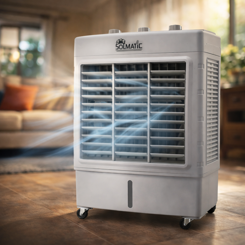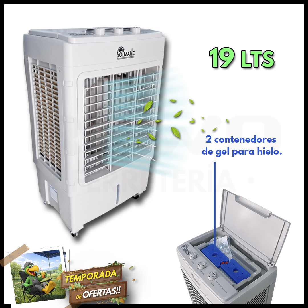 SOLMATIC enfriador evaporativo portatil 19L es una solución eficiente para refrescar espacios interiores y semiabiertos mediante un sistema de enfriamiento natural por evaporación. Su diseño portátil facilita moverlo entre distintas áreas del hogar, oficina, comercio o taller, permitiendo mejorar el confort térmico sin requerir instalaciones complejas ni consumo energético elevado.