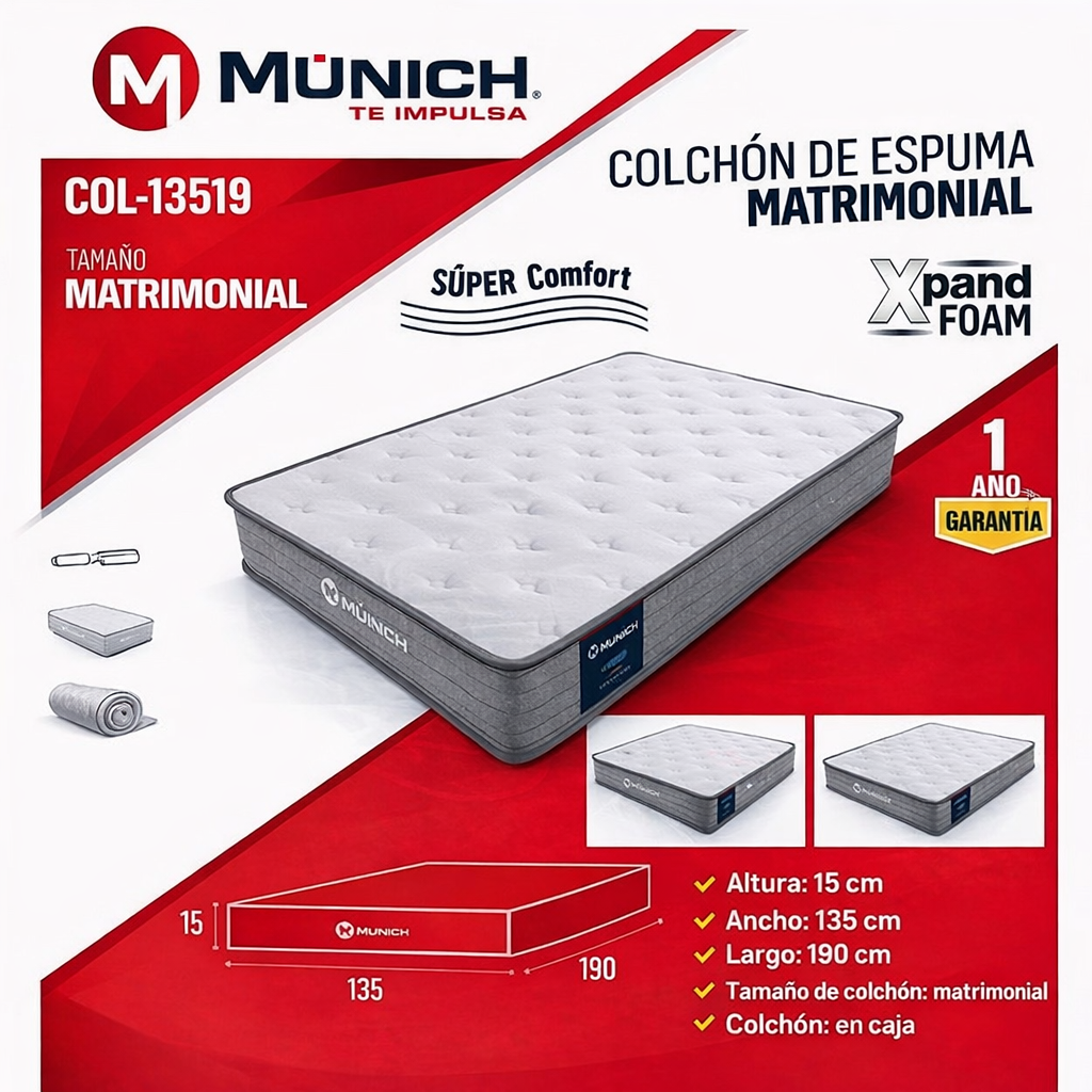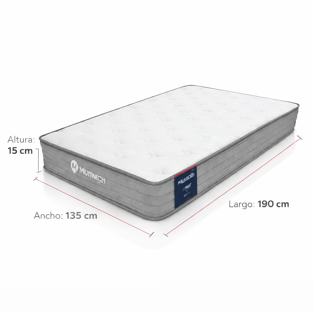 munich colchón de espuma matrimonial 15cm es una excelente opción para quienes buscan un colchón cómodo, moderno y con soporte equilibrado para dos personas. Su diseño de espuma de firmeza media proporciona una experiencia de descanso estable, evitando hundimientos incómodos y ofreciendo un soporte adecuado para la espalda. Además, gracias a su tamaño matrimonial, resulta ideal para habitaciones principales, cuartos secundarios, departamentos o alojamientos temporales donde se busca combinar funcionalidad, confort y precio accesible.