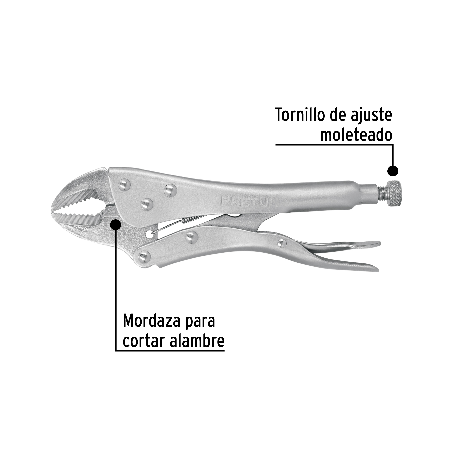 Este modelo mantiene bloqueada la pieza mientras libera la mano del operador, lo cual facilita usar otras herramientas, retirar pernos, ajustar tornillos o manipular piezas sin perder el punto de sujeción. Su largo de 10″ (25 cm) combinado con una apertura máxima de 2″ (50 mm) lo hacen adecuado para piezas medianas empleadas en mecánica, plomería ligera, herrería, construcción y mantenimiento automotriz.