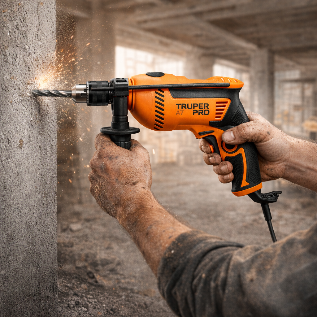 Rotomartillo Truper 650W 1/2 pulg es una herramienta eléctrica robusta diseñada para perforaciones en concreto, metal y madera, ofreciendo rendimiento constante y gran precisión. Gracias a su sistema de doble función, permite alternar entre modo taladro y rotomartillo dependiendo del material y del tipo de trabajo, lo que lo convierte en una solución eficiente tanto para usuarios profesionales como para proyectos domésticos de instalación, mantenimiento o carpintería.