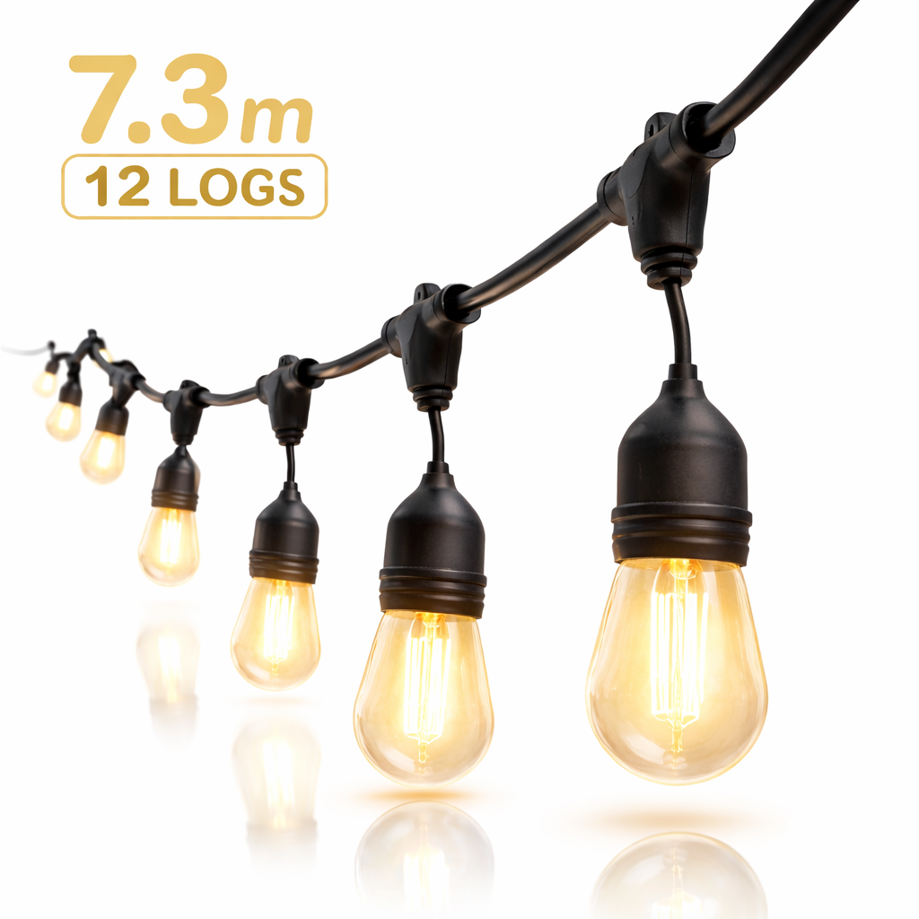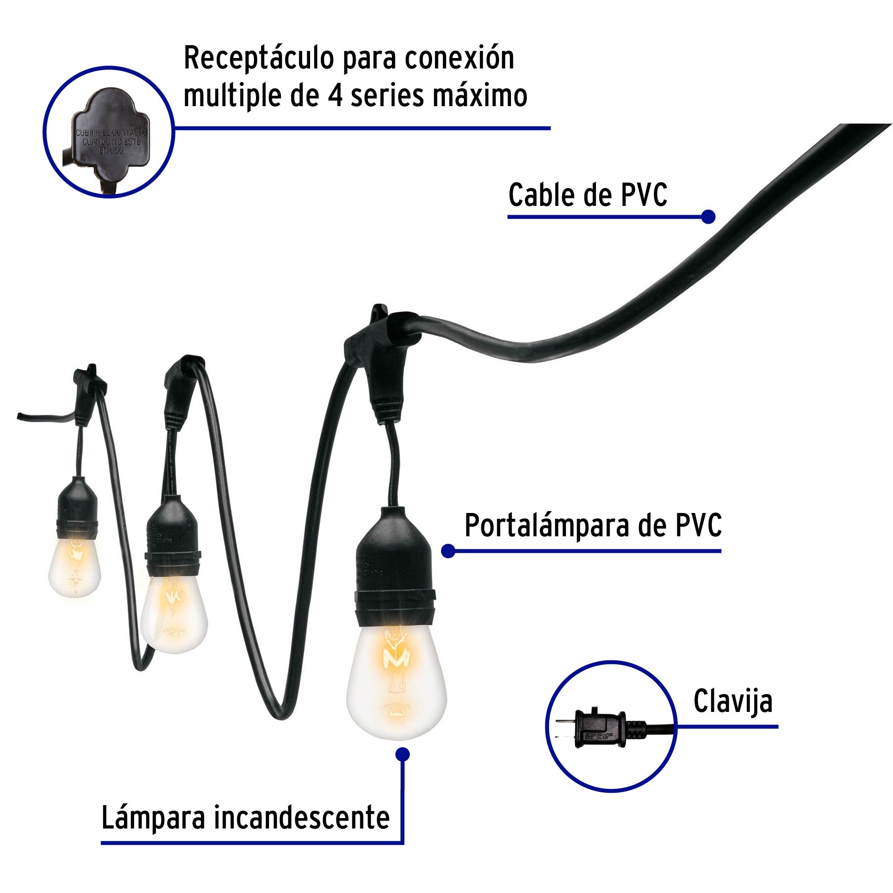 Esta serie cuenta con un largo total de 7.3 metros e incluye 12 lámparas incandescentes instaladas, además de 6 lámparas de repuesto, lo que asegura continuidad de uso y facilidad de mantenimiento. Cada lámpara es compatible con formato S14 y ofrece una potencia de 11 W, proporcionando una luz cálida de 3,000 K que genera un ambiente confortable y decorativo.