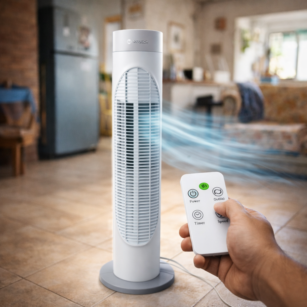 Este ventilador de torre es adecuado para recámaras, oficinas, salas, áreas de recepción o espacios donde se requiere ventilación continua con diseño vertical y operación sencilla.